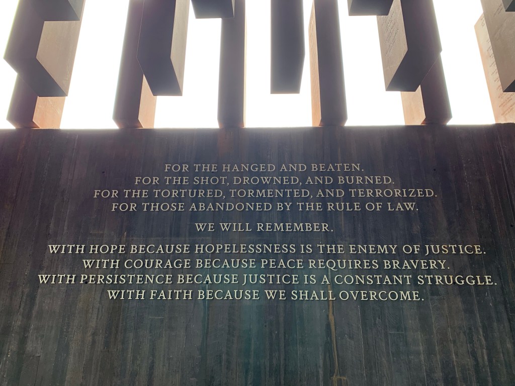So much is packed into this small but mighty museum: the story of the Montgomery Bus Boycott, sparked by the courage of Rosa Parks and the leadership of a 26 year old Martin Luther King, Jr., image after image of “Whites Only” or “Colored Waiting Room” signs, texts of statute after statute banning any kind of contact between Blacks and whites, other than oppression and subservience. You enter the Museum to a replica of the slave market pens where enslaved people were kept, in places like Montgomery, until they were sold. You hear first person accounts from these enslaved people, making unavoidable the visceral experience of this particular form of hell. A few steps away, you hear the first person accounts of people unjustly incarcerated for crimes they did not commit.