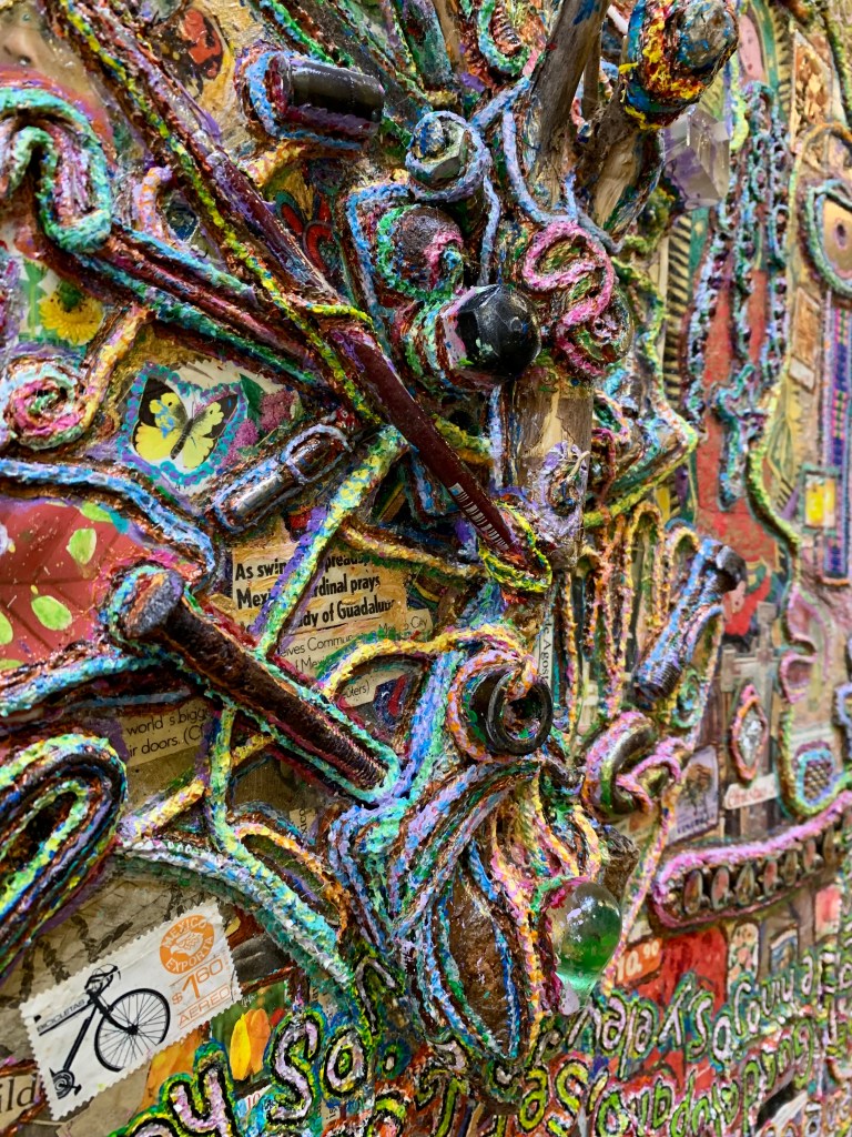 The sentences meander and loop across the canvas, finding their way around embedded objects such as used paint tubes, bits of glass, cloth dolls, and buttons. If, as Paul Klee once said, a “drawing is simply a line going for a walk”, then these collages show Lisa’s mind wandering through the universe, inviting us to come along.