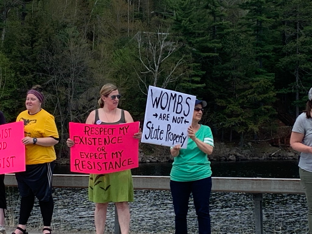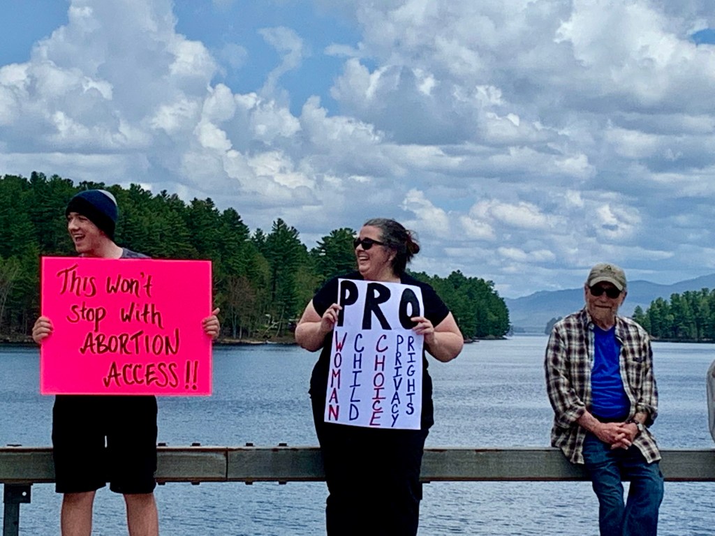 Steph handed out fliers from an organization called Adirondack Voters for Change, dedicated to promoting progressive politics in the Adirondacks. As the flyer noted “We are privileged to live in a safe state…Traveling to a state that protects abortion rights to receive care requires a lot of time, resources, and support. Assets many people do not have. We cannot be complacent in our safe space; we do not have that luxury.”