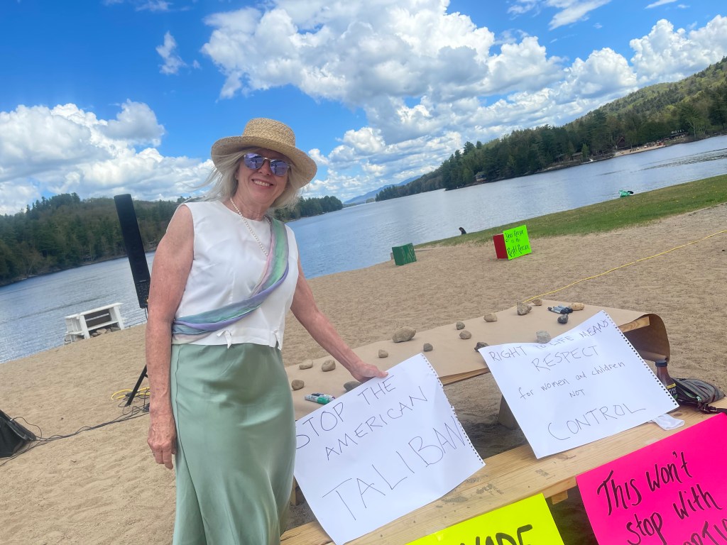 The Long Lake Bans Off Our Bodies rally gathered a little before noon on Saturday. About 35 women and a few men assembled on the Long Lake Town Beach, where a speaker and microphone had been set up. Nearly everyone carried a hand-lettered sign: “This Won’t Stop with Abortion Access” “Wombs are Not State Property”, sentiments seen around the country that day.
