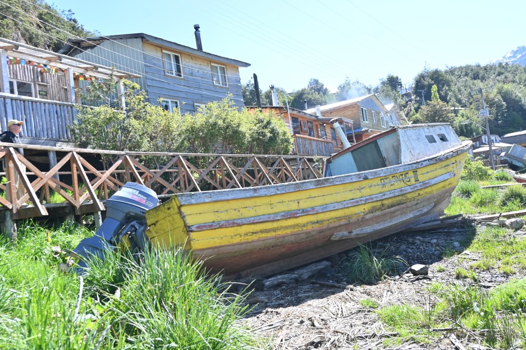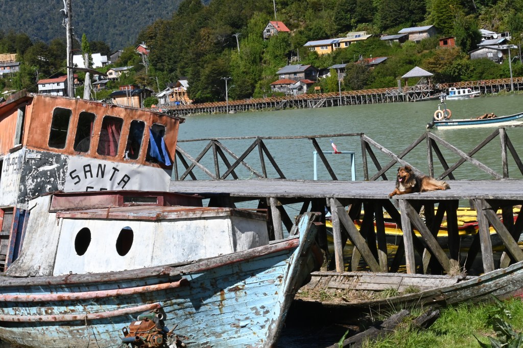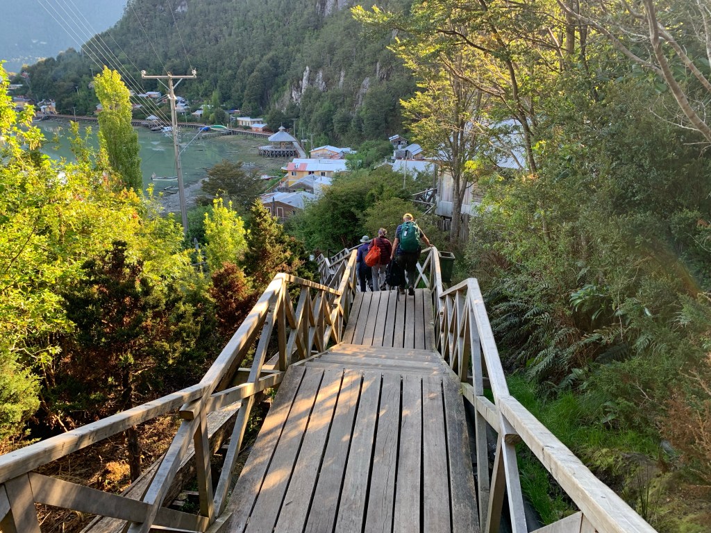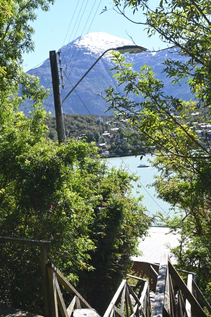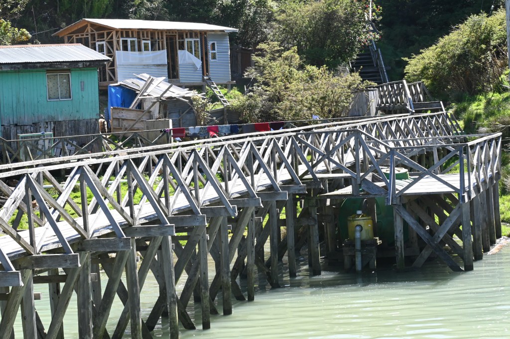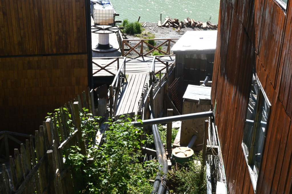 There are no streets in Caleta Tortel, but a spiders web of overlapping boardwalks made from the local cypress trees. Google Maps struggles to tell us how to get to our hotel— its algorithm never contemplated this stacking of stairs and wooden pathways almost hovering over the water.