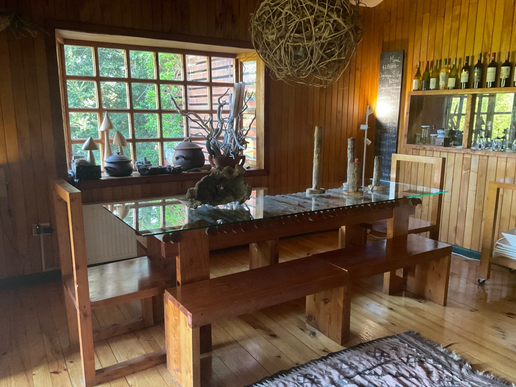 Our hotel for two nights, Lodge Entre Hielos (Between Glaciers), wowed us with a kind of rustic elegance. Maria, the owner, and her husband created the space in 2008 and built all the furniture by hand. The wooden wall and floors and furnishings are now burnished to a glowing cherry-like patina, softened with thick wool throws and rugs. The place is decorated from the land—a chandelier of twisted twigs, vases of angled driftwood, polished black stones on the window sills. Our rooms looked out over the water. I slept peacefully with the window open under thick blankets.