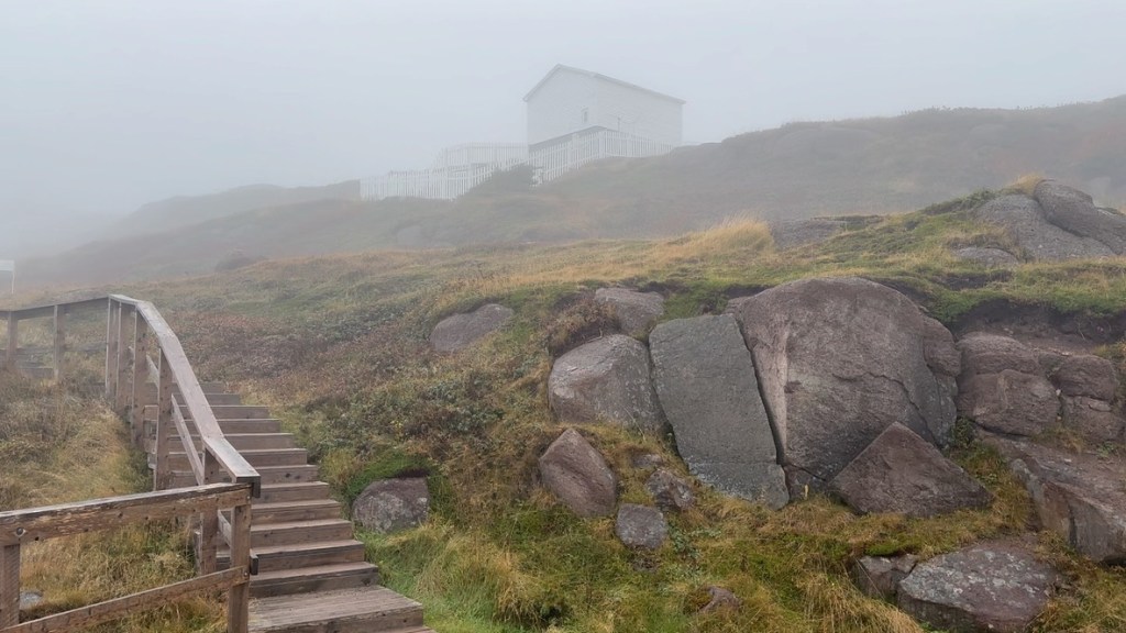 The walk was nearly empty of visitors and I walked slowly toward the lighthouse. The path is framed by a few simple clapboard structures—a community center, a house, a utility building. Like many wooden buildings in Newfoundland, they are brightly painted and weatherbeaten at the same time. I stopped by a relic of an ancient cannon to take pictures of furious waves crashing against the ever-present soaked cliffs. It is impossible in Newfoundland not to take such photos.