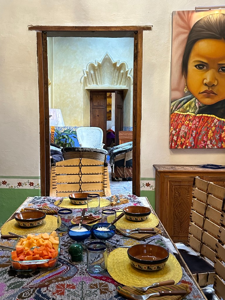 We had a view from a second floor balcony to the Parroquia, especially beautiful lit up at night. The owner offered to have two local women come in to make us breakfast—fresh salsa with marjoram and thyme, chilaquiles, tortillas, fresh squeezed orange juice. We paid them separately from a hand-scribbled listing of the groceries they had purchased that morning. Two Mexicos.
