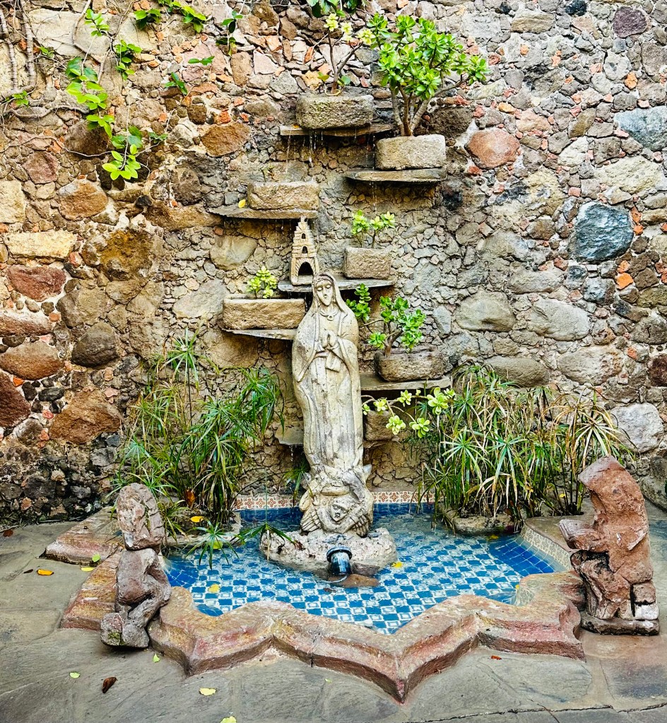 Our AirBnB lodging for the four nights we were in San Miguel felt like the culmination of the American owner’s lifetime of Mexican art collection fantasies. We had a 400-year old mansion built around a shaded courtyard now lushly filled with fountains, statuary, fuschia and purple bougainvillea climbing over trellises and balconies.