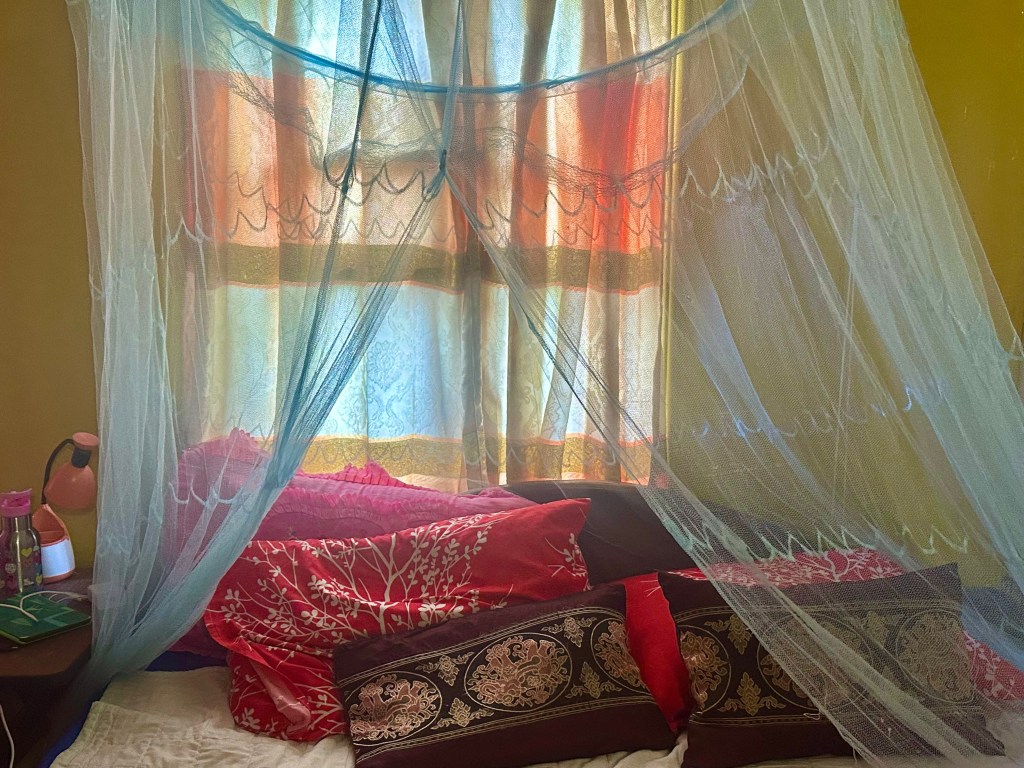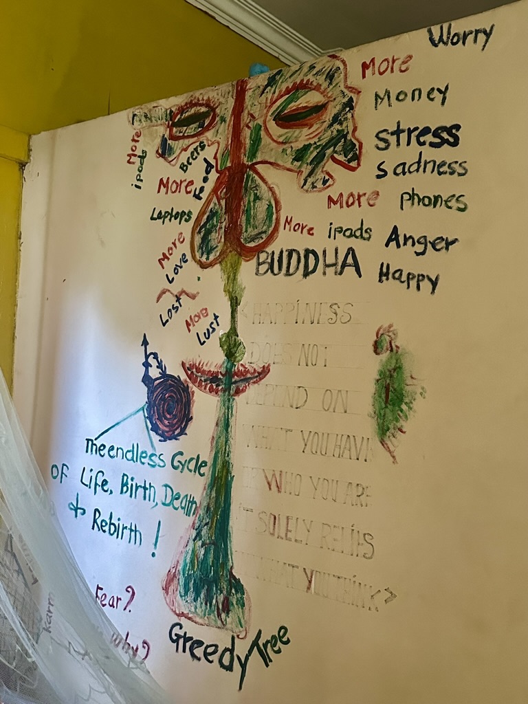 The rooms upstairs are simple but comfortable, adorned with inspirational sayings from Bun and Maria, colorful netted canopies over the bed, brocaded purple curtains and swags over the doors, inspirational inscriptions on the walls.