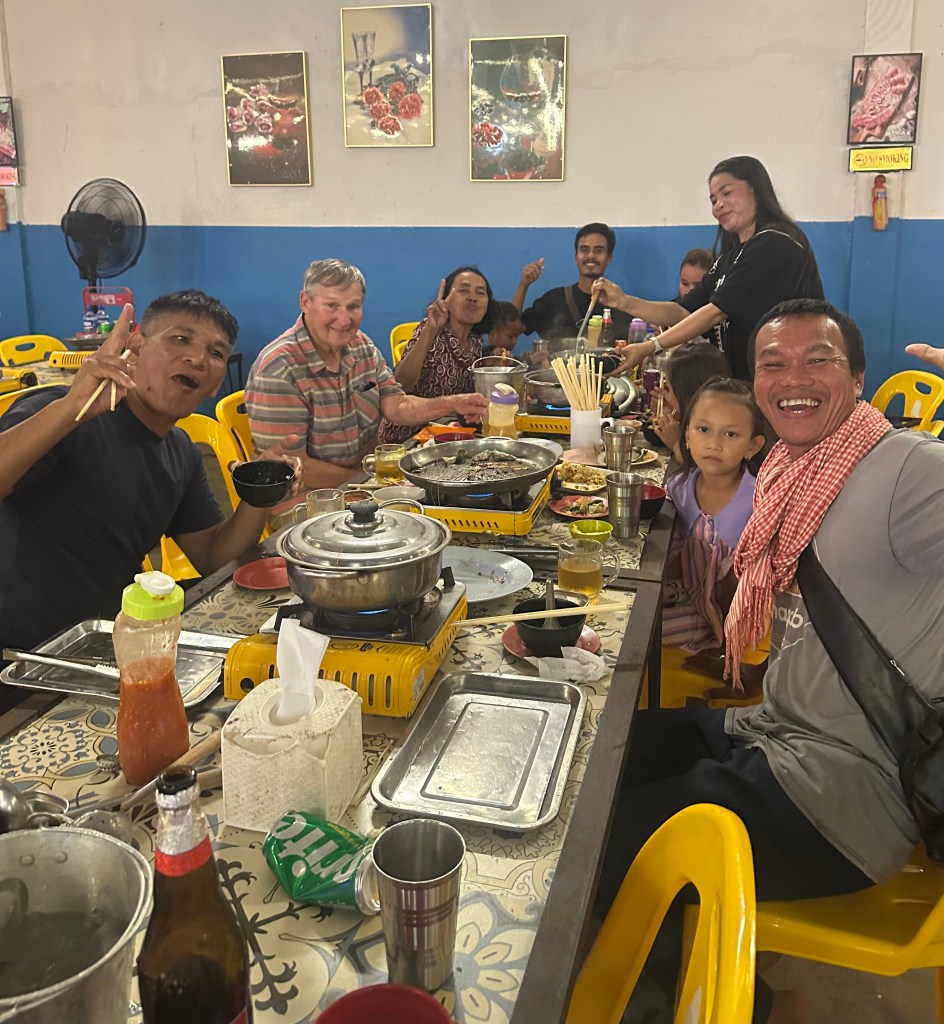 Back in Siem Reap, we end our three and a half days with dinner out a local barbecue restaurant. We have offered to take Bun’s family out to dinner, and before we knew it, we had an evening with a sister and brother in law and a schoolmate of Bun’s children and his parents. We ate at long tables with hibachis in the center and cooked our own seafood, selected from heaping mounds of raw fish in the center of the cavernous room. This was all washed down with Cambodian beer and we were serenaded by Khmer pop music. It was a loudly convivial evening with Bun cheerfully translating nonstop for us.