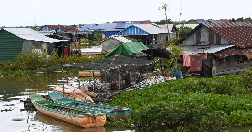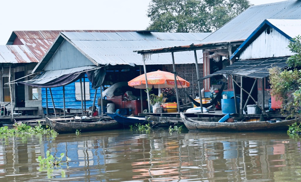 The residents of Mechrey live in spare wooden huts with corrugated metal roofs, floating on small barge-like structures along the river channel. The paint has long since weatherd away.
