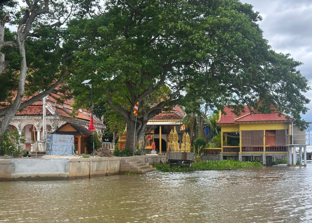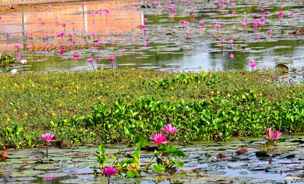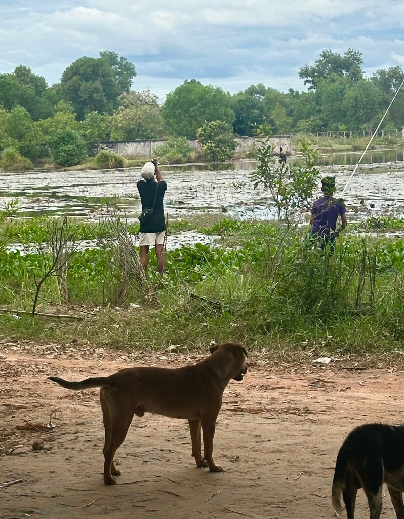 It is surrounded by overgrown brambles and trees and across the road is a flooded rice paddy in which brilliant fuchsia lotus blossoms open every morning to greet the sun. Boys fish for frogs which will be eaten.